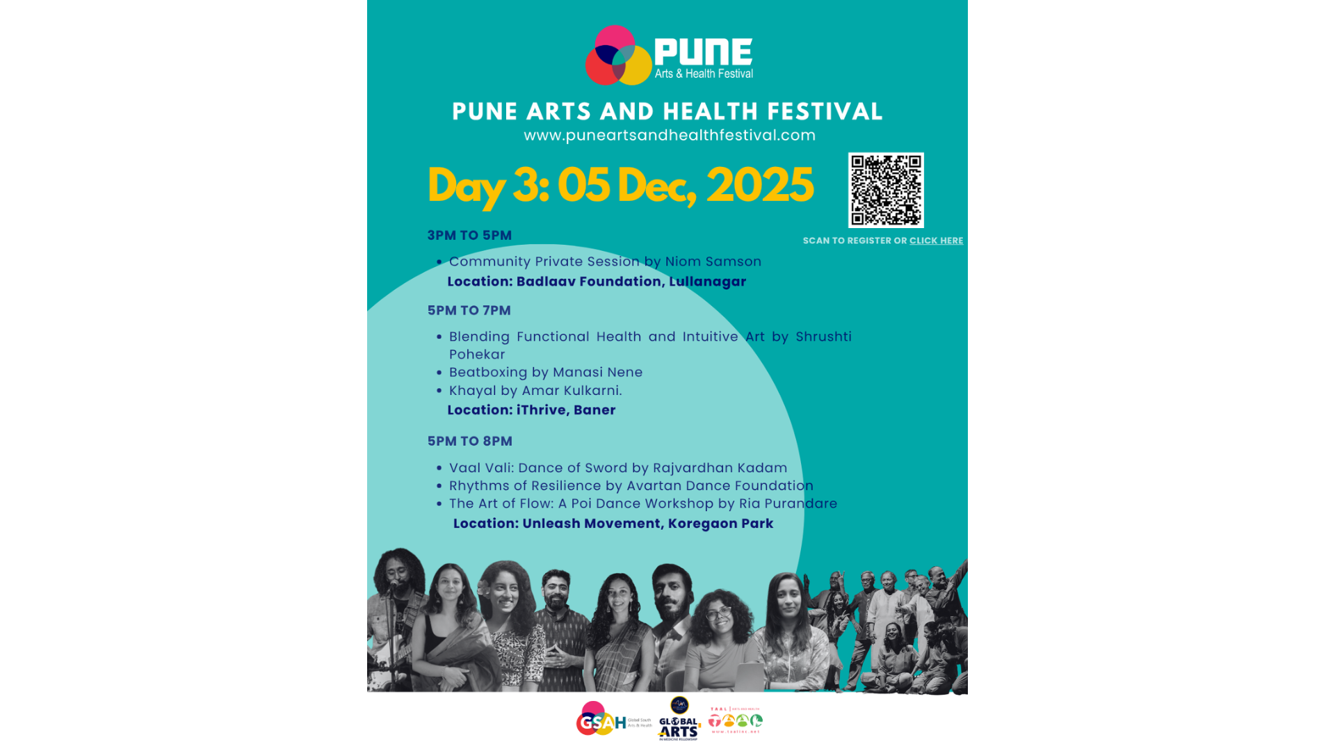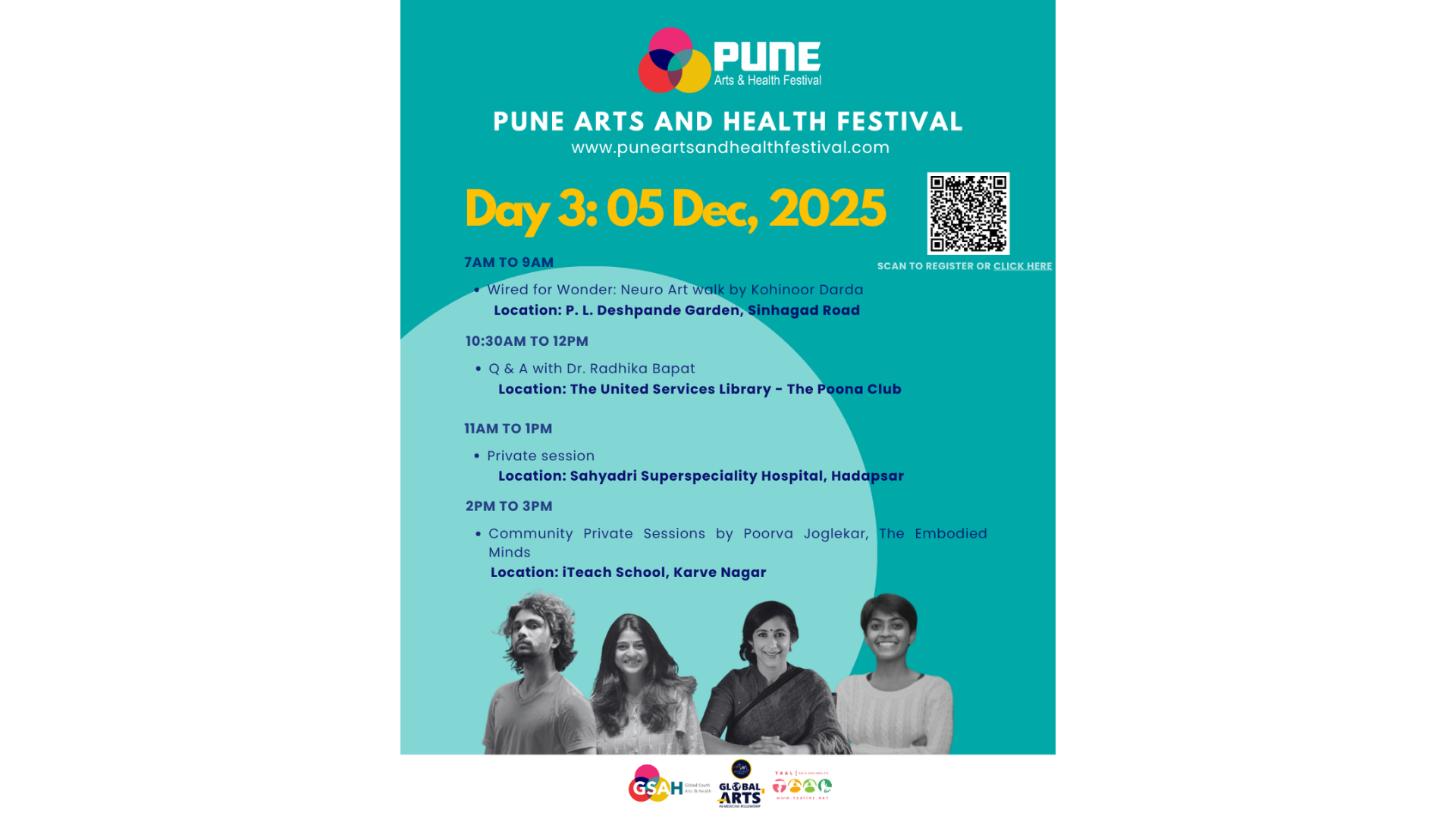 The Pune Arts & Health Festival 2025 is a five-day festival that brings together creative artists, healthcare professionals, educators, and citizens to explore the intersection of arts and health. This is a community-centered initiative to celebrate the transformative power of the arts and spread awareness of the health benefits of the arts. As part of the Global South Arts and Health initiative and the Arts in Medicine Fellowship, this event aims to position Pune as a key contributor to the global movement promoting wellness through creativity. Set with the backdrop of increasing research supporting the role of the arts in enhancing mental health, social cohesion, and community care, the festival will include interactive workshops, performances, public art installations, research presentations, community forums, and a variety of innovative activities across the city.